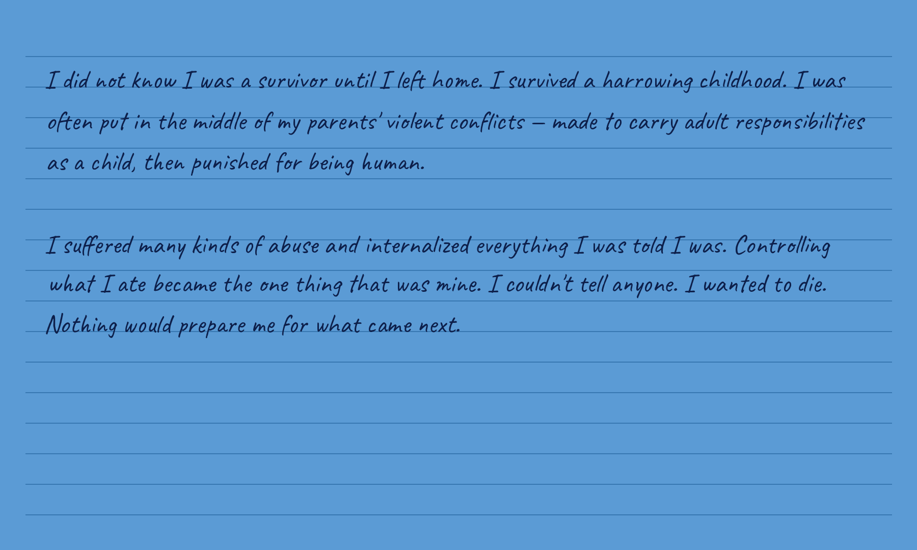 Survivors are everywhere. They sit next to you in class, pass you in the hallway, hold the door open at the grocery store. They don’t always look like what you imagine. They don’t always know yet what they are.